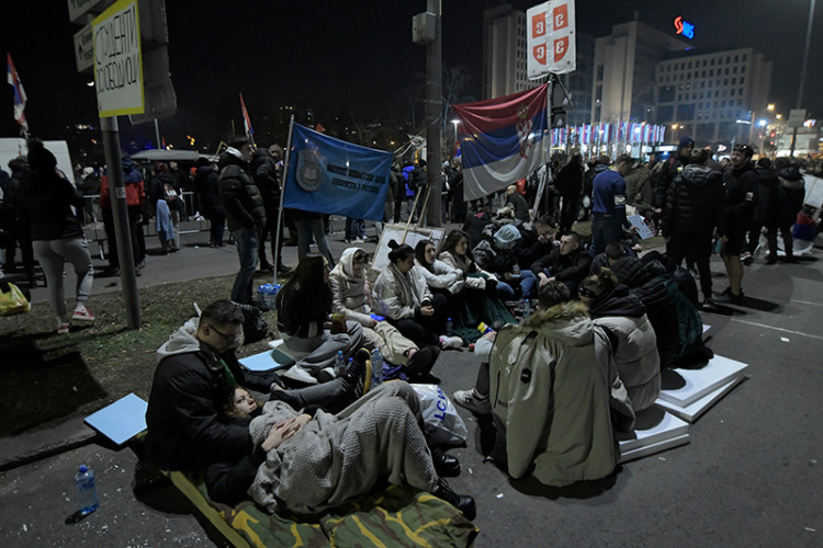Blokada Mosta slobode trajala je cijelu noć, a studenti su spavali na ulici, u šatorima ili na stiroporu, piše Blic.