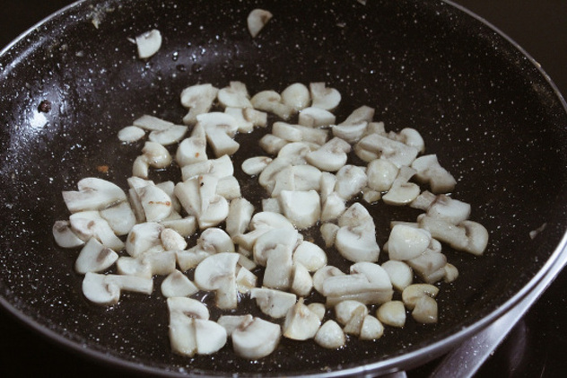 Za umak očistite i izrežite gljive. Prepržite ih sa začinima – vegetom, solju, biberom, bijelim lukom u prahu i sušenim celerom.