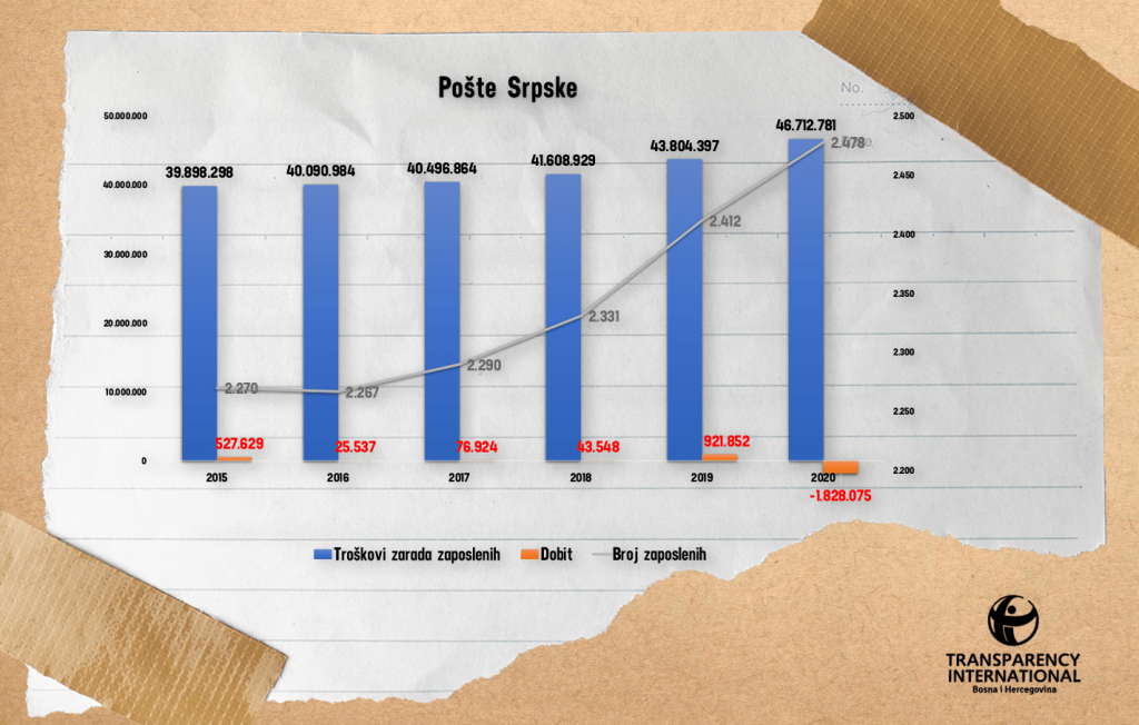 Od 2015. godine broj zaposlenih radnika u Poštama Srpske povećao se za 208, izdvajanja za plate povećala su se za 6,8 miliona maraka a ovo javno preduzeće koje je te 2015. imalo dobit od pola miliona u 2020. godini iskazalo je gubitak od 1,8 miliona KM.