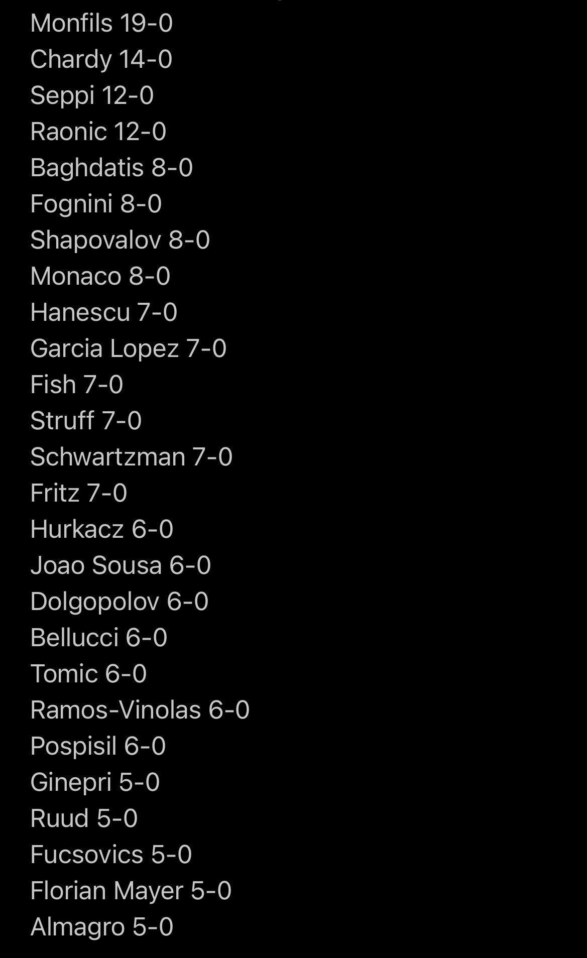 Monfis, Šardi, Sepi, Raonić, Bagdatis, Fonjini,Šapovalov, Monako, Hanesku, Garsija Lopes, Fiš, Štruf, Švarcman, Fric, Furkač.. Dug je spisak igrača koji sa Đokovićem izvjesno vrijeme ne znaju za pobjedu, navodi Alo.