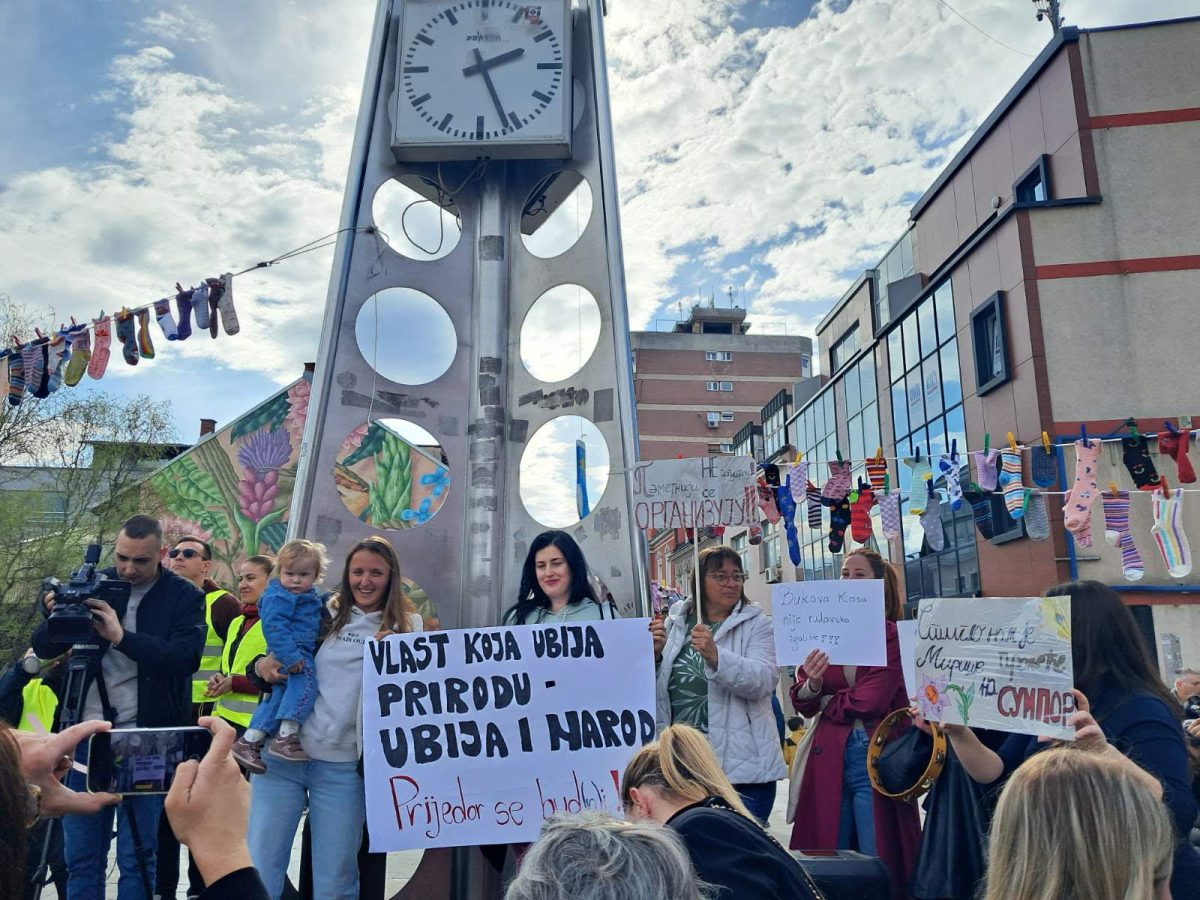 “Ni kiša nas ne može zaustaviti – jer nemamo drugu zemlju, drugo selo, drugu rijeku. Došli smo ovdje da kažemo  dosta je ignorisanja, dosta je trovanja naše vode, zemlje i vazduha”, poručili su  iz neformalne grupa građana “Prijedor se budi”.