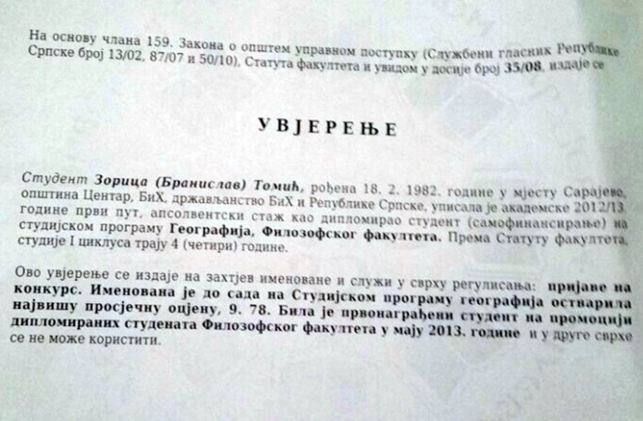 Naime, Zorica priča da je 2012. diplomirala na katedri za geografiju sa ocjenom 9,78. To je bila najviša prosječna ocjena koju je jedan student uspio da ostvari od kada postoji taj odsjek na Filozofskom fakultetu u Istočnom Sarajevu.