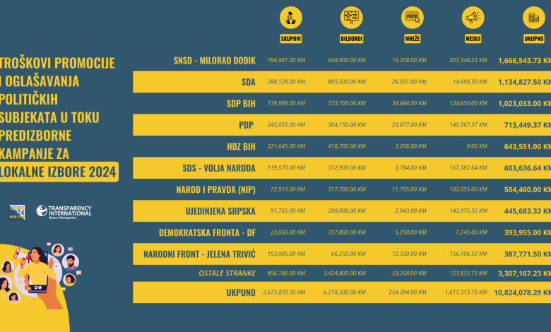 Transparency International u BiH predstavio je rezultate monitoringa troškova izborne kampanje, koji pokazuju da su stranke do 1. oktobra potrošile oko 10,8 miliona KM na bilborde, reklame u medijima (televizija i štampani mediji), oglase kompanije Meta i predizborne skupove.