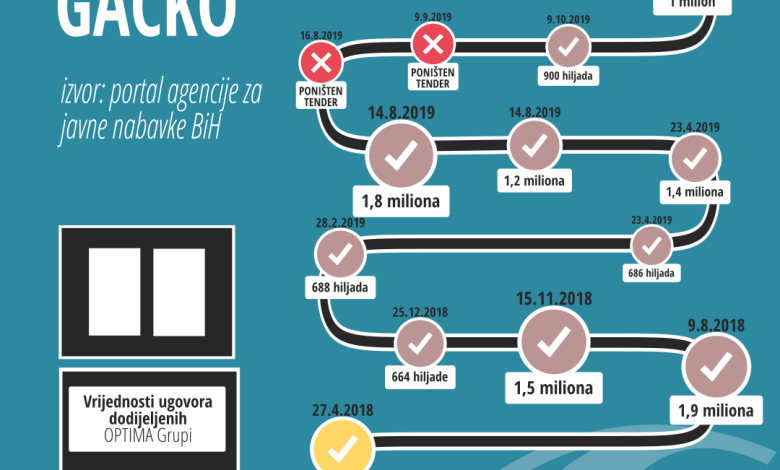 Informaciju o ovakvom ponašanju ovog ugovornog organa TI BIH je objavio u julu prošle godine jer je od 2015. do tada Optima Grupi dodijeljeno oko 25 miliona KM. U međuvremenu poništen je još jedan postupak a Optima Grupa dobila je još tri ugovora vrijedna oko 4 miliona KM zbog krajnje hitnosti.