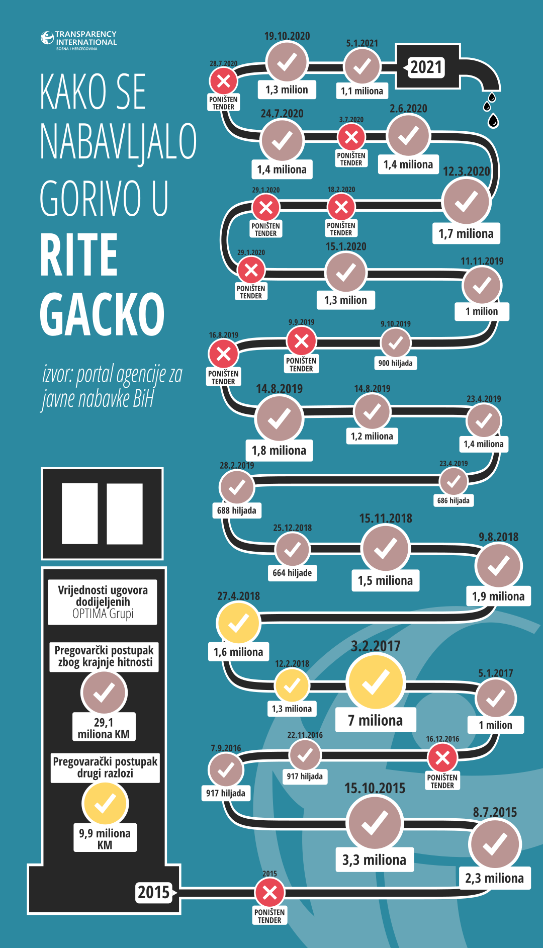Transparency International u BiH (TI BIH) podnio je krivičnu prijavu protiv rukovodstva RITE Gacko koje je bez ikakvog javnog nadmetanja dodijelilo Optima Grupi posao nabavke goriva vrijedan 29,1 milion KM. Ugovori su dodijeljeni putem pregovaračkog postupka koji se može primjenjivati samo u izuzetnim slučajevima propisanim Zakonom o javnim nabavkama a objašnjenje za ovakav potez bar zvanično je „krajnja hitnost uzrokovana nepredvidivim događajima“.