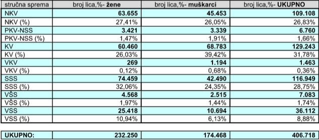 Najmanje nezaposlenih je visokokvalifikovanih radnika (VKV) – 1.194, polukvalifikovanih radnika (PKV) – 6.760, te onih sa višom stručnom spremom (VŠS) – 7.083. Nezaposlenih sa visokom stručnom spremom (VSS) je 36.112.