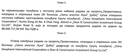 U odluci, koju je 2. novembra potpisao ministar zdravlja Dragan Bogdanić, navedeno je da je najpovoljnijeg ponuđača za projektovanje, izgradnje i opremanje nove JZU bolnica „Sveti apostol Luka“ Doboj izabrana grupa ponuđača “China Sinopharm International Corporation i Shan Xi Construction Investment Group Co.Ltd“, koja je ponudila da ovaj posao uradi za 88,5 miliona KM bez PDV-a.