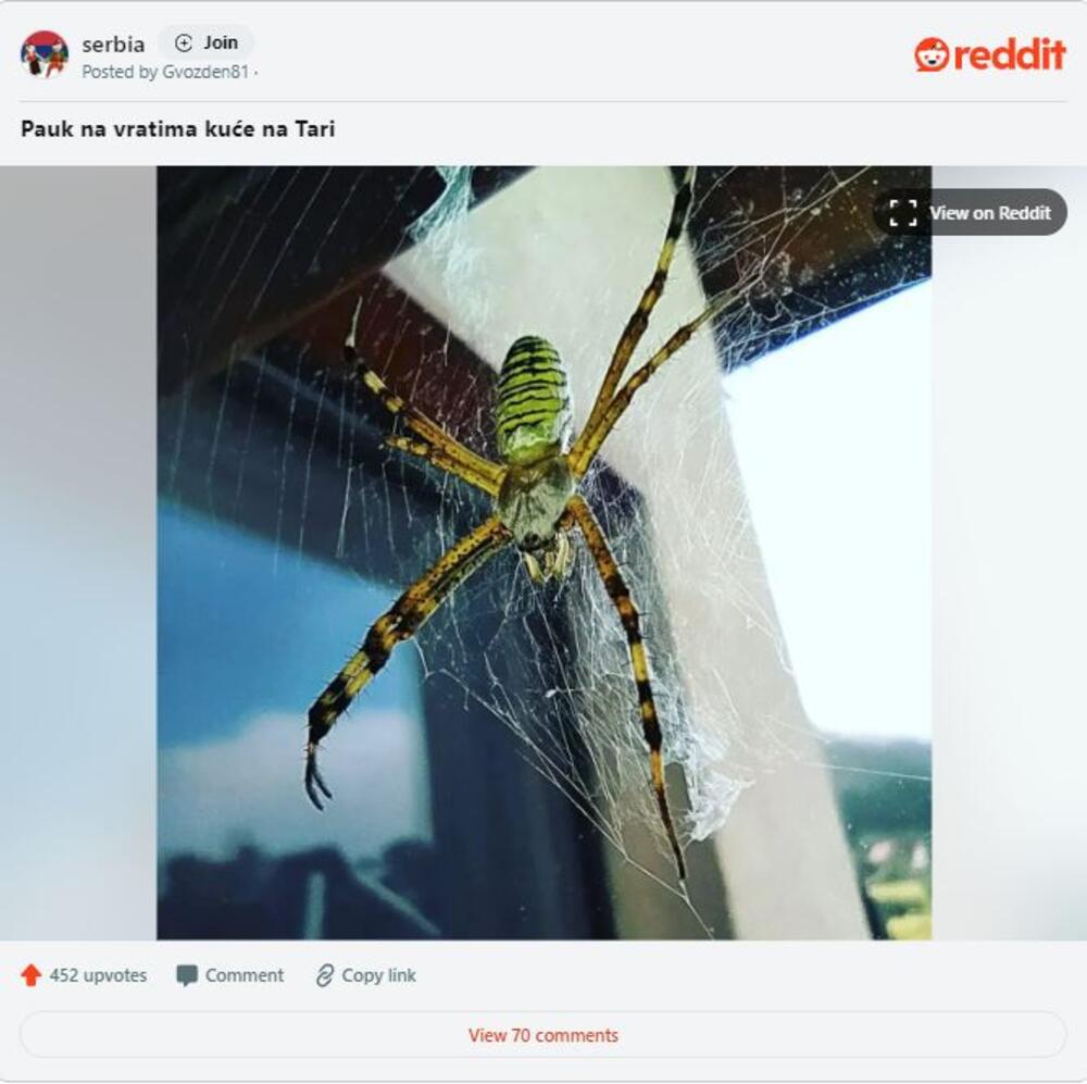 Na Reditu je jedan korisnik objavio fotografiju ogromnog osolikog pauka kog je uslikao na vratima kuće na Tari.